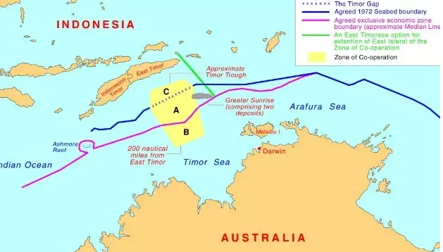 因此,澳大利亚支持印尼吞并东帝汶,并承认东帝汶属于印尼的一个最大好处,就是印尼同意两国在这区域的海洋边界以 “帝汶海沟”进行划分。此外,两国还成立了一个共同开发区,即图中黄色区域:其中靠近东帝汶的“C”区的矿产税收益90%归印尼,10%归澳大利亚,中间的“A”区则是50-50对半分,靠近澳大利亚的“B”区则90%归澳大利亚,10%归印尼。