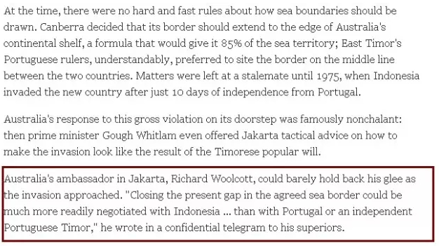 可为何澳大利亚要这么做呢?根据《卫报》的报道,当年澳大利亚驻印尼大使给出的理由是:因为如果东帝汶独立了,一定会与我们重新划定海洋边界,这对我们的利益有很大的损害,所以不如让印尼吞并了东帝汶,我们再和印尼人谈判。