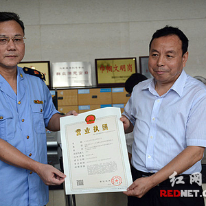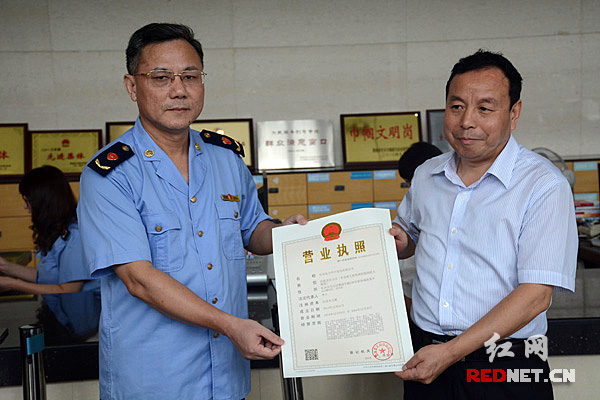 湖南省工商局党组书记、局长李金冬(左)向长安电力华中发电有限公司副总监、总会计师樊根荣(右)发放“五证合一”的营业执照。