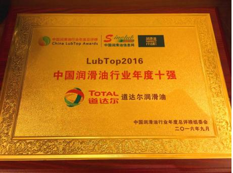 道达尔润滑油荣膺“2016中国润滑油行业年度十强”