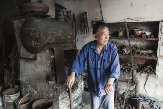 ▲何铁匠 2012年7月15日,北二马路19号,“常丰铁器店”的主人何文斌。69岁的何文斌出身于长沙捞刀河铁匠世家,这栋房屋是1937年他岳父母购置的。何爹爹现在一天能打10来把菜刀初品。对于拆迁,他要求不高,“让我有一个地方能打铁就行了。”