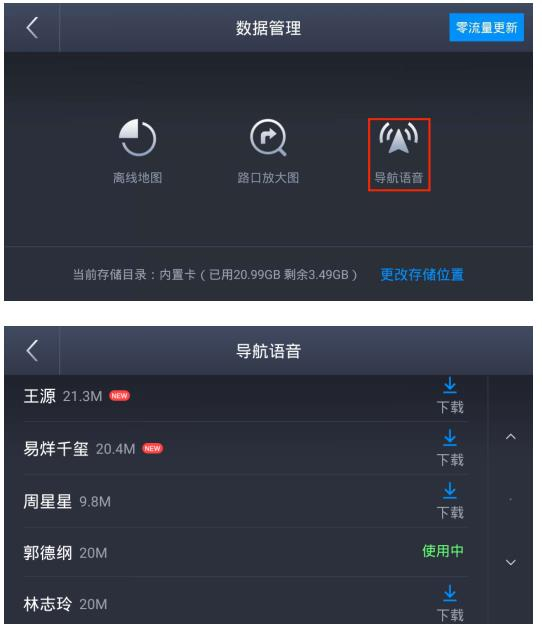 与传统的车载导航不同,高德地图车机版将高德地图手机版的传统亮点功能——明星语音进行了全面移植。高德地图车机版的用户只需前往高德地图车机版官网(www.amapauto.com),进入“语音包下载”页面,或者在拥有联网功能的车上打开车机,在数据管理——导航语音中,都可以下载高德地图的明星语音包。