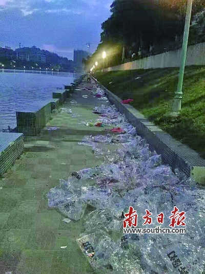 中秋节当晚,佛冈县城潖江河畔大量遗留的孔明灯包装袋。