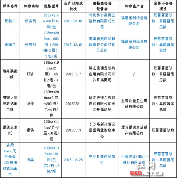 此外,锦江麦德龙现购自运有限公司长沙开福商场销售的舒洁随身装面巾纸(生产日期或批次:2016.3.7;规格型号:166mm*195mm(2层)、45抽/组、4组/包)及明佳甜蜜之家抽取式面巾纸(生产日期或批次:2016.03.21;规格型号:130mm*200mm*2层*200抽/包*4包/提)、长沙高新开发区皇盛商业购物中心销售的银鸽卫生纸(生产日期或批次:2016.03.13;规格型号:136mm*114mm/节*3层、10卷/提)均为细菌、真菌超标的不合格产品,长沙市民选购时需谨慎。