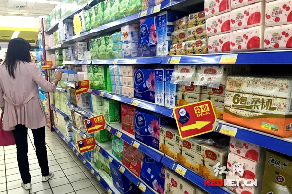 某超市内,维达、清风、好吉利、洁柔、心相印等纸巾品牌占领货架