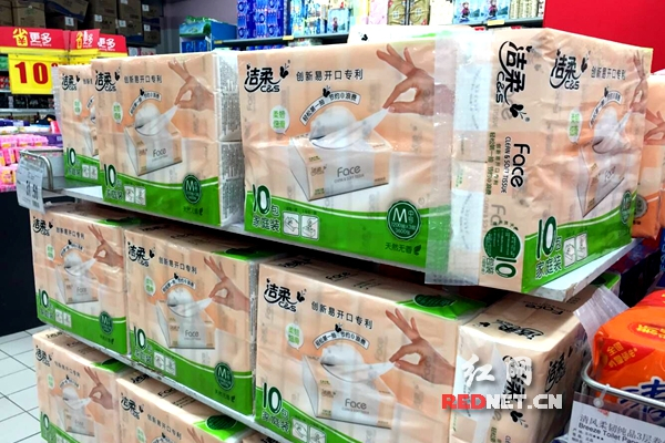 记者走访长沙家乐福、步步高等超市发现,维达、清风、好吉利、洁柔、心相印等纸巾品牌占领货架。其中,“好吉利”“洁柔”促销品多,有价格优势,较受消费者欢迎,且铺货量大。调查发现,目前超市销售的两品牌面巾纸以2016年1月以后生产的为主,三款不合格产品暂未见销售。