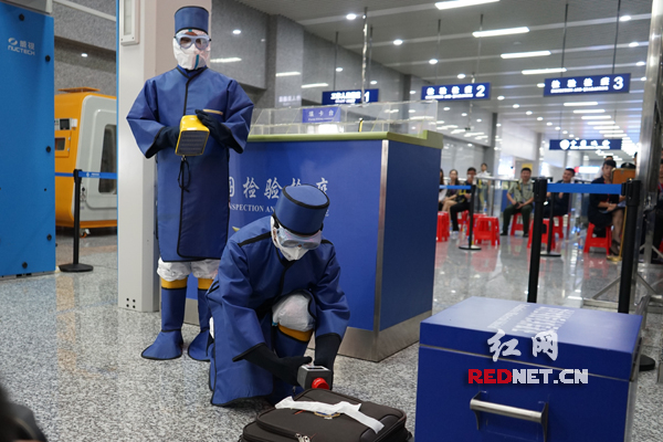 今天上午,检验检疫人员在张家界机场口岸举行核与辐射突发事件应急演练。