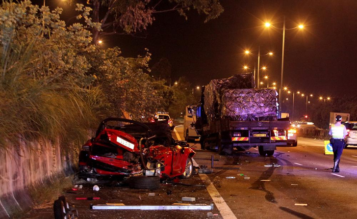 现场消息称,拖车已亮起黄色闪灯,及车尾照明射灯,远处亦可目视,且拖车与私家车当时正位于公路肩,车辆不可以驶入路肩。不幸地,一辆正沿慢线行驶、载有空运货物的中型货车,突然如炮弹冲入路肩,左边车身撞向房车右边车尾,再“泰山压顶”式辗过房车右边车身,货车再撞及正站在房车前、拖车后的拖车司机,他被撞飞约10米外,头部及身体多处受伤昏迷;货车再将私家车撞至甩架,房车被推前约12米停下,车顶被压扁;拖车更被撞前约50米始停下。