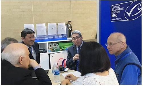 美国大西洋海角渔业董事长丹尼(右一)与吴厚刚(右四)今年3月在波士顿展会上交流。