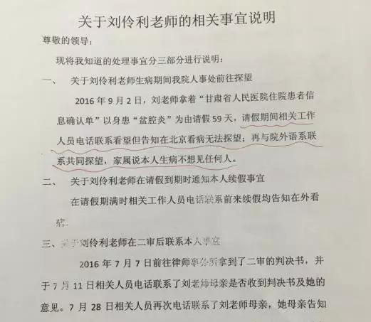 兰州交通大学博文学院院长陈玲表示:2015年1月15日左右,因为学校年终要对教职工进行考核,系上就提出,刘伶利老师从请假到现在半年多没有到学校上班,严重影响教学。编制就这么多,老师的课时没办法完成。2015年1月15日左右,就形成了院长办公会议决定,决定解聘刘伶利老师。她请假时出具的是省人民医院的盆腔炎的证明,我们一直认为她患一般病,没来学校上班,以为她在外面找到其它工作了。