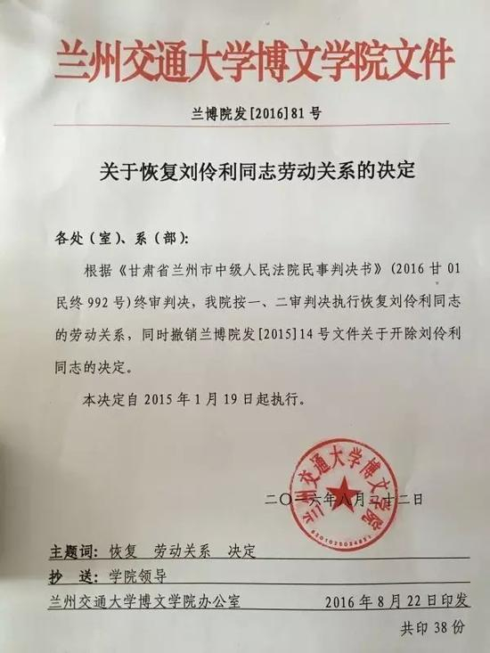 8月22日,兰州交通大学博文学院又有新说法。当天,兰州交通大学博文学院下发的“兰博院发(2016)81号”文件写明,根据《甘肃省兰州市中级人民法院民事判决书》(20165甘01民终992号)终审判决,博文学院按一、二审判决执行恢复刘伶利的劳动关系,同时撤销“兰博院发(2015)14号”文件关于开除刘伶利的决定。这份文件同时指出,本决定自2015年1月19日起执行。