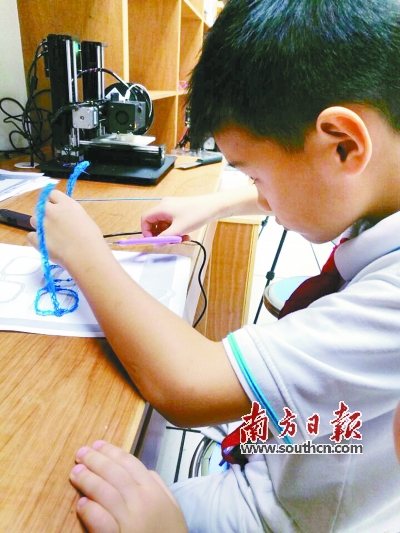 石岐中心小学学生正在用3D打印笔设计眼镜。高薇 摄