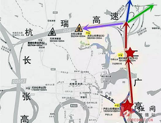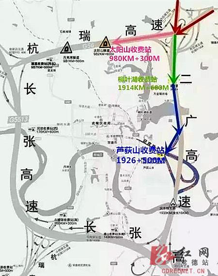 出城建议路线:大部分去往岳阳、湖北、张家界方向的驾驶人会选择在常德北(太阳山)收费站进入高速公路,导致节假日期间该收费站通行压力剧增,建议广大驾驶人绕行柳叶湖、芦荻山收费站。
