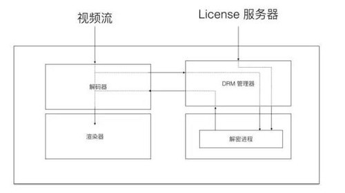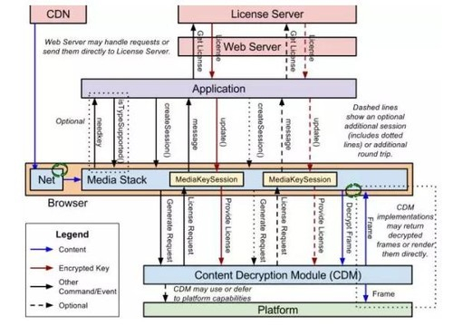 在浏览器内部,基于视频内容的元信息,EME 可以通过识别它使用了哪个 DRM 系统加密,并调用相应的解密模块(Content Decryption Module, CDM)解密 CENC 加密过的内容。解密模块 CDM 则会去处理内容授权相关的工作,获得密钥并解密视频内容。