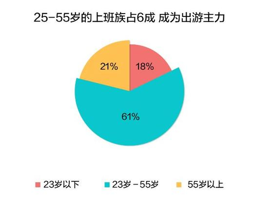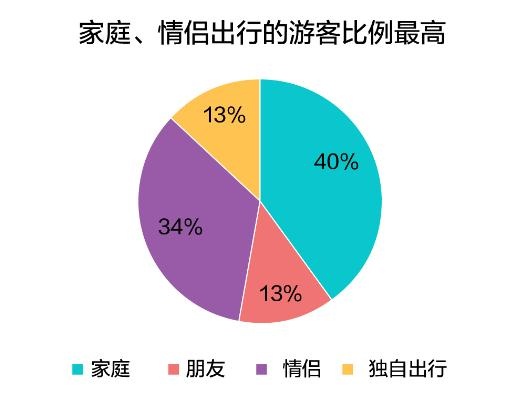 从出游人群看,上班族、家庭、女性成为关键词。从携程旅游客户的大数据来说,平时假期有限的上班族在黄金周集中“爆发”,年龄段在23-55岁之间的群体占到出游总人数的6成以上。90、00后崛起,占比18%。55岁以上的中老年人也习惯通过网站报名,占了21%。女性游客成为出游主力,占比59%比男性高18个百分点,女性主导旅游的时代来临。他们倾向于和谁一起度过假期?家庭和情侣出行的比例最高,分别占比40%和34%。