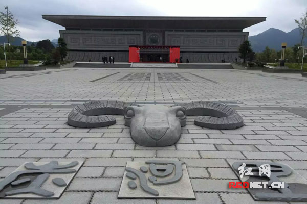博物馆前坪地面上的羊头浮雕造型源自“四羊方尊”上四角的羊头。