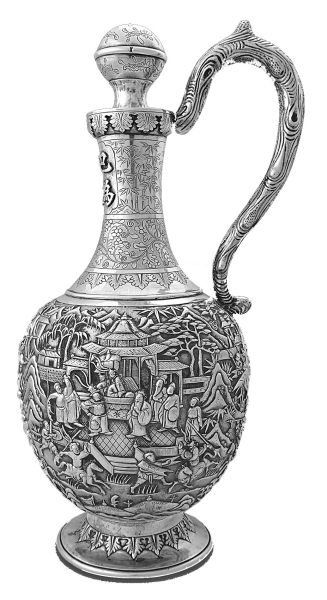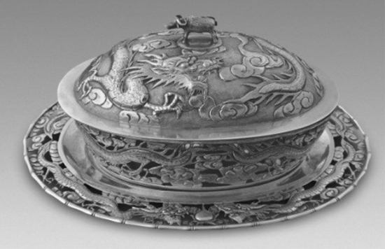 1840年以后,西方列强用坚船利炮打开了中国国门。从“五口通商”开始,随着一系列不平等条约的签订,中国被迫开埠的口岸城市不断增加,外销银器的产地也不断扩大,上海、天津、汉口、九江等地也开始外销银器。这一时期来华经商的西方人士越来越多,随着对中国文化理解和认知的加深,他们逐渐接受和喜欢上了中国传统的艺术形式。因而这一时期的外销银器在满足使用功能的基础上,在器物造型及装饰方面,增加了更多的中国传统文化元素,呈现出中西合璧的面貌。