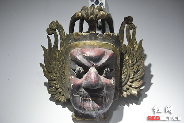 展出的清代三元大帝中的上元真君唐宏,面具体型庞大,两边有耳翅。