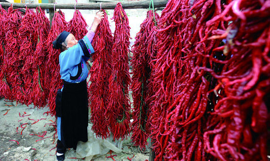 走进神秘的侗乡,侗族人会告诉你,在他们的家乡到处是七山一水两分田,家家户户的房屋或吊脚楼的横梁上都挂着一串串鲜艳辛辣的红辣椒。这就是侗族人喜欢吃辣椒的象征。