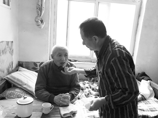 父亲偏瘫,刘树兴给老人边剃胡须边擦流下来的口水。本报记者 陈玮 摄本报记者 陈玮