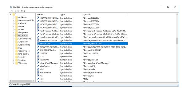 这里看的有点辣眼睛,但是我们不需要理他。因为我们可以直接使用WinObj来得知他创建的设备符号链接名为:Htsysm72FB。有了此符号链接名,我们可以使用CreateFile函数来打开它的驱动设备并且发送控制码来利用了。。