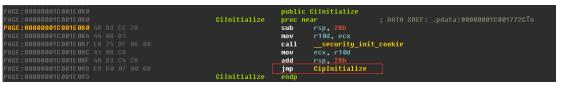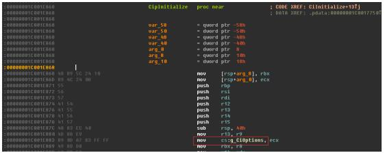 可以发现,该变量存在于CipInitialize 函数中,但是此函数未导出,不过庆幸的是。CI.dll给我们导出了CiInitialize函数,改函数最后会调用CipInitialize。