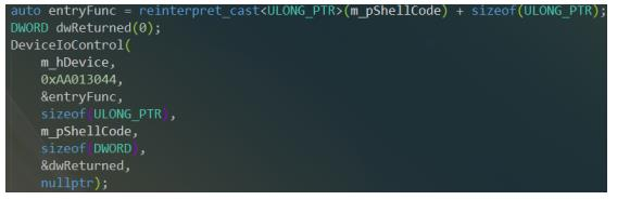 最后,开始向Capcom.sys发送控制码来利用此驱动。值得注意的是0xAA013044为64位模式,0xAA012044为32位模式。需要传递的shellcode为之前的模板+8处,以此来绕过暗桩。