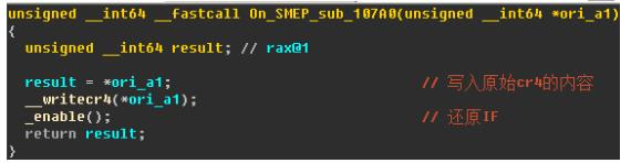 因为在WIN10 14393版本上,经过测试SMEP已被加入PatchGuard豪华套餐中。所以需要尽快的将SMEP恢复,这也就意味着我们的利用函数需要尽量的简短。当然了,时运不济的话,可能就在那一瞬间就被检测到了。