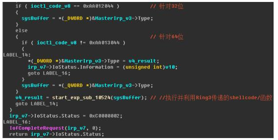可以知道,当控制码为0xAA012044时,代表的是32位模式,当控制码为0xAA013044时,代表的是64位模式。此驱动样本为64位,所以我们着重研究64位的控制码0xAA013044即可。