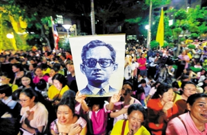 普密蓬国王病重期间,大批泰国民众自发聚集在曼谷诗丽叻医院门口为国王祈福,不少人在祈福过程中激动落泪。