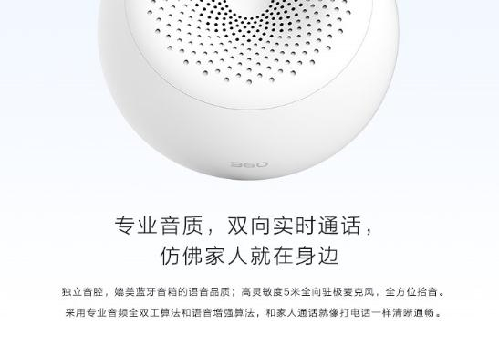 开启全部感官,守候家庭安全。在声音传达上,360智能摄像机悬浮版采用专业音频全双工算法和语音增强算法,配合独立音腔底座设计,实现媲美蓝牙音箱的专业音质。语音通话更清晰,让沟通没有距离。高灵敏度5米全向驻极麦克风,全方位拾音,不遗漏丝毫细节。