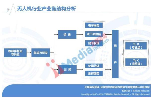 无人机行业产业链与普通高科技产品一样,具有研发、制造、销售三个主要环节。伴随着专业级无人机和消费级无人机的应用推广和需求增加,无人机行业产业链将进一步完善,走向行业的成熟期。