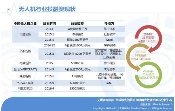 随着无人机行业的走热,大量无人机企业涌入行业,并受到资本市场的青睐,获得大额投资。2014年发生38笔融资案例,总金额1.14亿美元,2015年发生74笔融资案例,融资4.54亿美元,相比2014年增长3倍。
