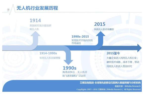 1990年以后军用无人机技术开始向民用市场溢出,2015年民用无人机市场开始引起关注。