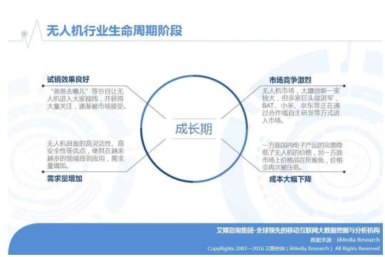 2015年是民用消费级无人机行业的元年,试销效果、市场竞争程度、需求量、成本降幅四个方面体现了整个行业处于生命周期的成长期阶段。