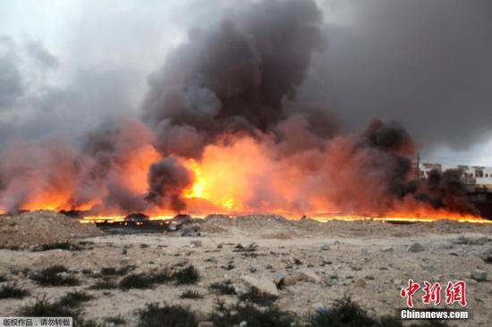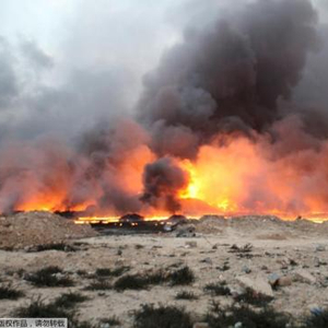 资料图:当地时间8月29日,伊拉克从极端武装手中收复了石油重镇Qayyara。图为被极端武装成员点燃的油田。