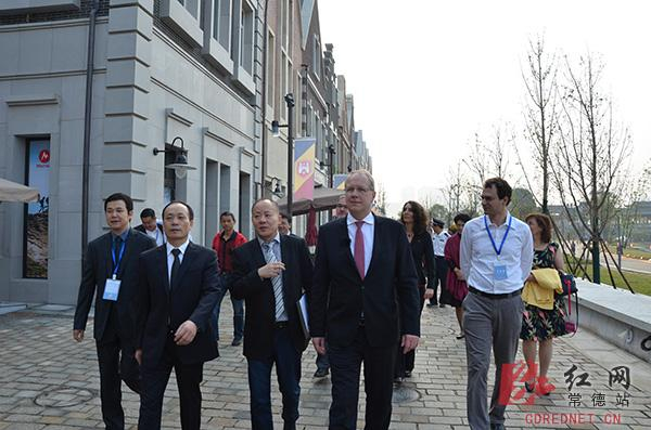 德国汉诺威市市长斯特凡•索斯托克(右二)在常德市委副书记、市长周德睿(左二)的陪同下参观德国风情街。