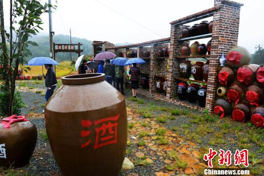 沿着盘山公路,中新社记者驱车直抵白溪村,村口的一个酒文化小广场格外醒目:简易的酒架上,摆满着一排排大小、形状不一的老酒坛子,坛上写着各种字体的“酒”字。