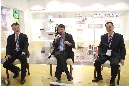 SAKURA樱花总经理黄耀庆(中)、整体厨房副总沈铭中(左一)、营业处总监孙保奇(右一)接受媒体采访