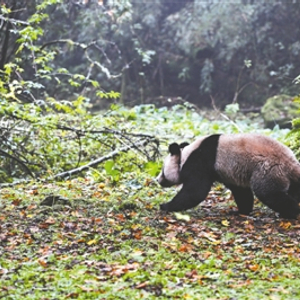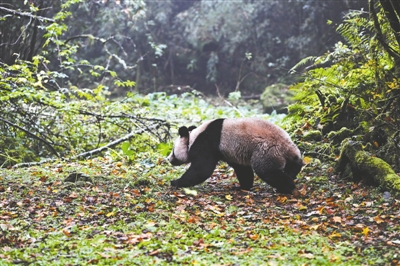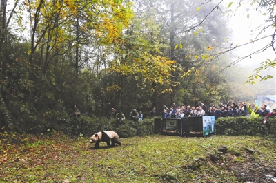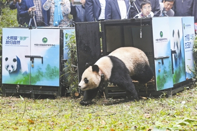 大熊猫“张梦”出笼显得很兴奋,没有丝毫的逗留,快步跑进放归点左侧丛林