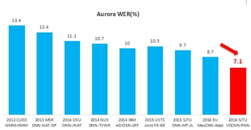 思必驰上海交大联合实验室目前所提出的模型和架构,在噪声环境语音识别的业界基准库Aurora4上,取得了7.09%的词错误率。相比于世界其他机构目前10%左右的最好结果,有一个大幅度的明显优势,在抗噪语音识别上是一个新的里程碑。此外,除了多类别的加性噪声,此模型也被验证在远场识别环境下也具有明显的优势。近5年,在Aurora4噪声数据库上,公开可查的世界上著名研究机构最好语音识别系统对比如下图所示: