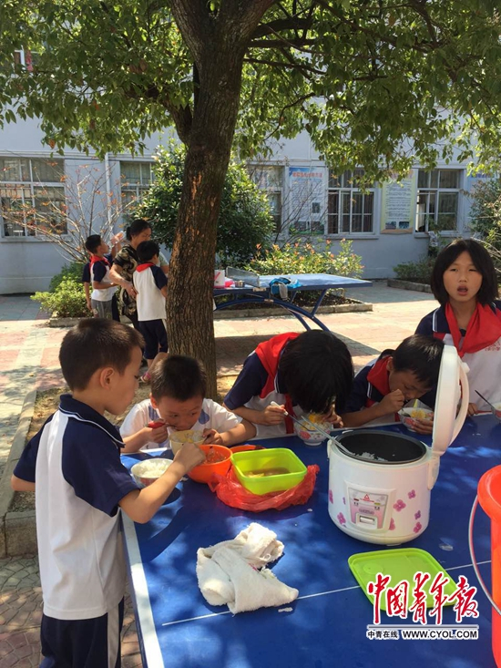弋阳农村小学,孩子们在校园吃午饭。他们的爸爸妈妈大都在外面打工,爷爷奶奶就承担起中午送饭的任务,有的老人最多要给六七个孩子送饭。中国青年报·中青在线记者李新玲/摄