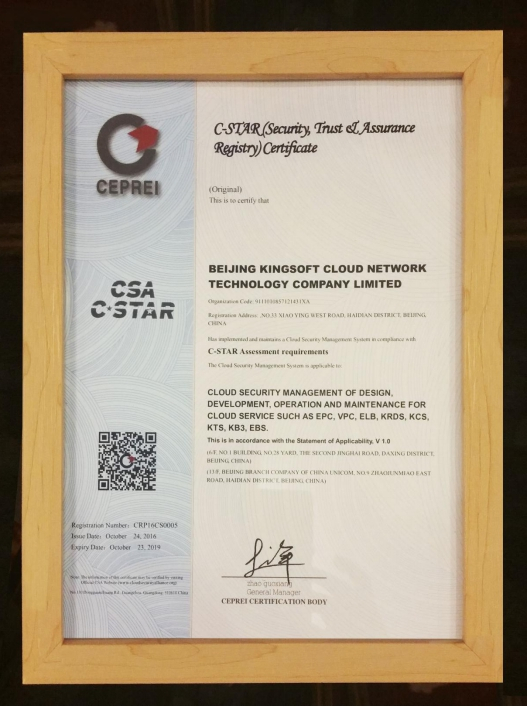C-STAR云安全认证是继国家信息安全等保三级、ISO9001、ISO27001、可信云安全等认证后,金山云获得的又一云安全认证。此次获得认证,标志着金山云安全能力和水平的进一步提升,体现了其可靠、安全的云计算服务能力已达到业界领先水平。