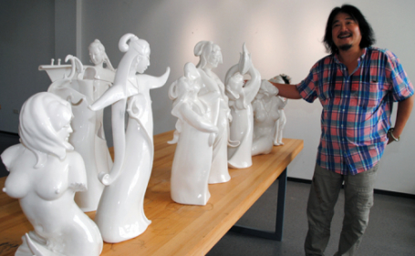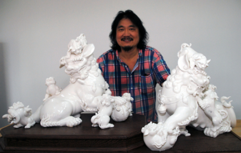 图:雕塑家裴铁涛为成龙艺术馆创作的“狮子家族”白瓷雕塑(摄影 黄坚)
