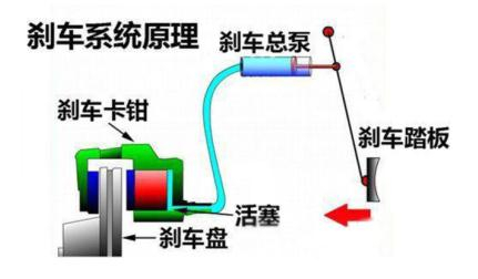 刹车系统主要是通过液压原理将脚上的力量释放给车轮。这股让车子停下来的力量可要比人脚踩的力量大很多很多。之所以能这样,离不开帕斯卡定律,用液力放大及杠杆原理。车子的N多部件都离不开液压技术,比如:液压助力转向、变速箱、减震器、支撑杆等等,刹车系统更是汽车领域中使用液压技术中的代表作。当驾驶员踩下刹车踏板,刹车踏板向下的行程中会推动制动总泵工作,总泵中的制动液会被输送到制动卡钳中,制动卡钳中的活塞被推动后,使刹车片与刹车盘产生强烈的摩擦力,这种力,就可以使车辆减速或者急刹。