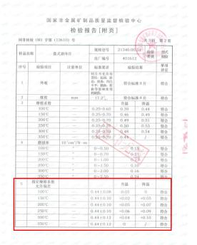 那么拥有四十多年品牌历史的Remsa耐磨士又是怎样做的呢?为了控制产品稳定性,不停的做相应测试以确定摩擦材料的特性稳定如初。下面看一组最新数据,国家质检中心国际测试报告显示,当测试温度达到350°时,耐磨士的摩擦系数依然保证在0.44左右,符合国标要求: