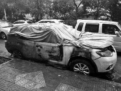 10月27日早7时30分左右,华商报记者在高新六路看到,绿港花园小区外人行道道沿下,一辆盖着车布的轿车颇为抢眼。银色盖布上污迹斑斑,还有不少铁锈。从裸露出的车身能看出,有明显焚烧过的痕迹,车后备箱没了盖子,车内部有不少灰烬,车后两个轮胎已经消失,只剩轮毂。由于该处为住宅小区,附近还有学校,早高峰时段通行车辆很多,通行速度很慢,经常造成拥堵。