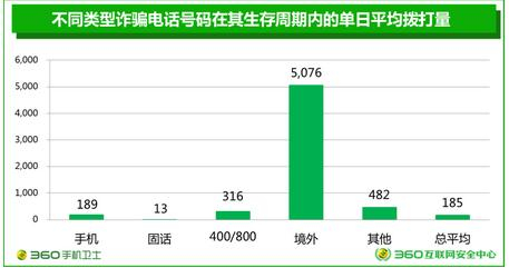 通常,一个电话销售一天能拨打50个以上电话已是高产。然而,360《报告》显示,当下,单个诈骗电话平均每天对外约拨打185次。据分析,使用单一固定电话号码拨打诈骗电话的频率最低,仅为平均13次/天;其次是手机号码,单个号码的拨打频率约为189次/天;400/800号码的单日拨打量就要大很多,单个号码的拨打频率约为316次/天。对此,360首席反诈骗专家裴智勇表示:“使用单一固定电话拨打率低,因为固话号码相对来说更容易被追踪,所以犯罪分子在使用时也会比较谨慎。”