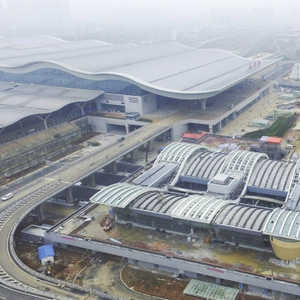 10月29日,包括东站房、红旗路高架、东广场在内的长沙火车南站东广场区域基本建成,正在进行红旗路辅道和东广场绿化扫尾施工。