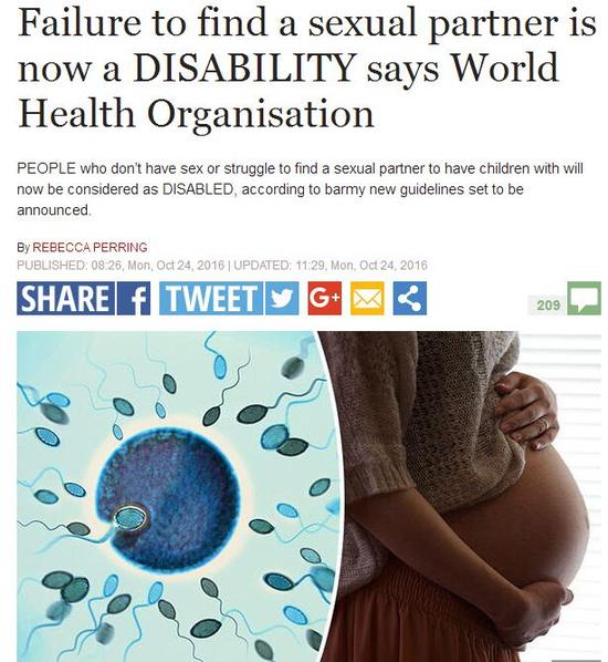[环球网报道 记者 余鹏飞]据英国《每日快报》10月24日报道,世界卫生组织正在酝酿一个新规定,那些长期没有性生活或找不到性伴侣,或者没有孩子的人,将可以被定性为为残疾人。